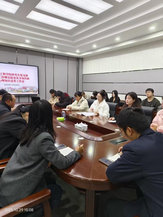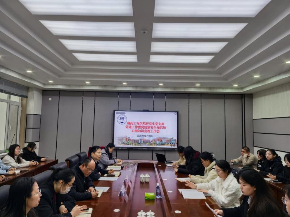 为深入推进党建工作与学科特色、学生培养深度融合,以党建引领实验室安全管理提质、心理健康教育增效,10月 29日下午,制药工程学院研究生党支部在制药楼227室召开党建工作部署会暨实验室安全知识与心理知识竞答工作会。学院党委书记王中华出席并讲话,党委副书记刘鹏程主持会议。学院组织员仲恒、丛璐,研究生辅导员钟梓俊、盛志成、刘薇薇以及各研究生党支部学生代表参会。
